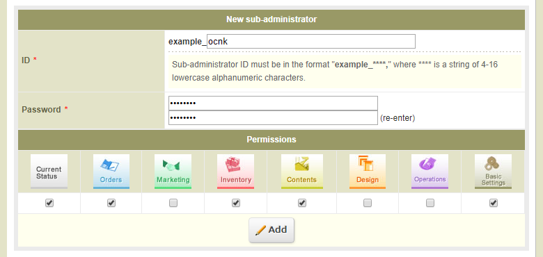 To create a sub-administrator account, enter an ID and password in the New sub-administrator section. The ID must be prefixed by the Ochanoko account ID, and will be used to log into Ochanoko from the main ocnk.com page. Select which Shop Manager tabs you would like the sub-administrator to have access to.