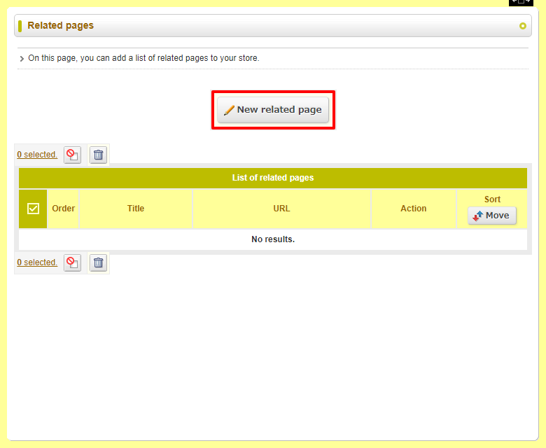 To add related pages, navigate in your Shop Manager to Contents → Related pages. Click the