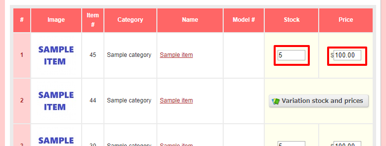 (Variation stock and prices) button to configure stock and prices for individual item variations.